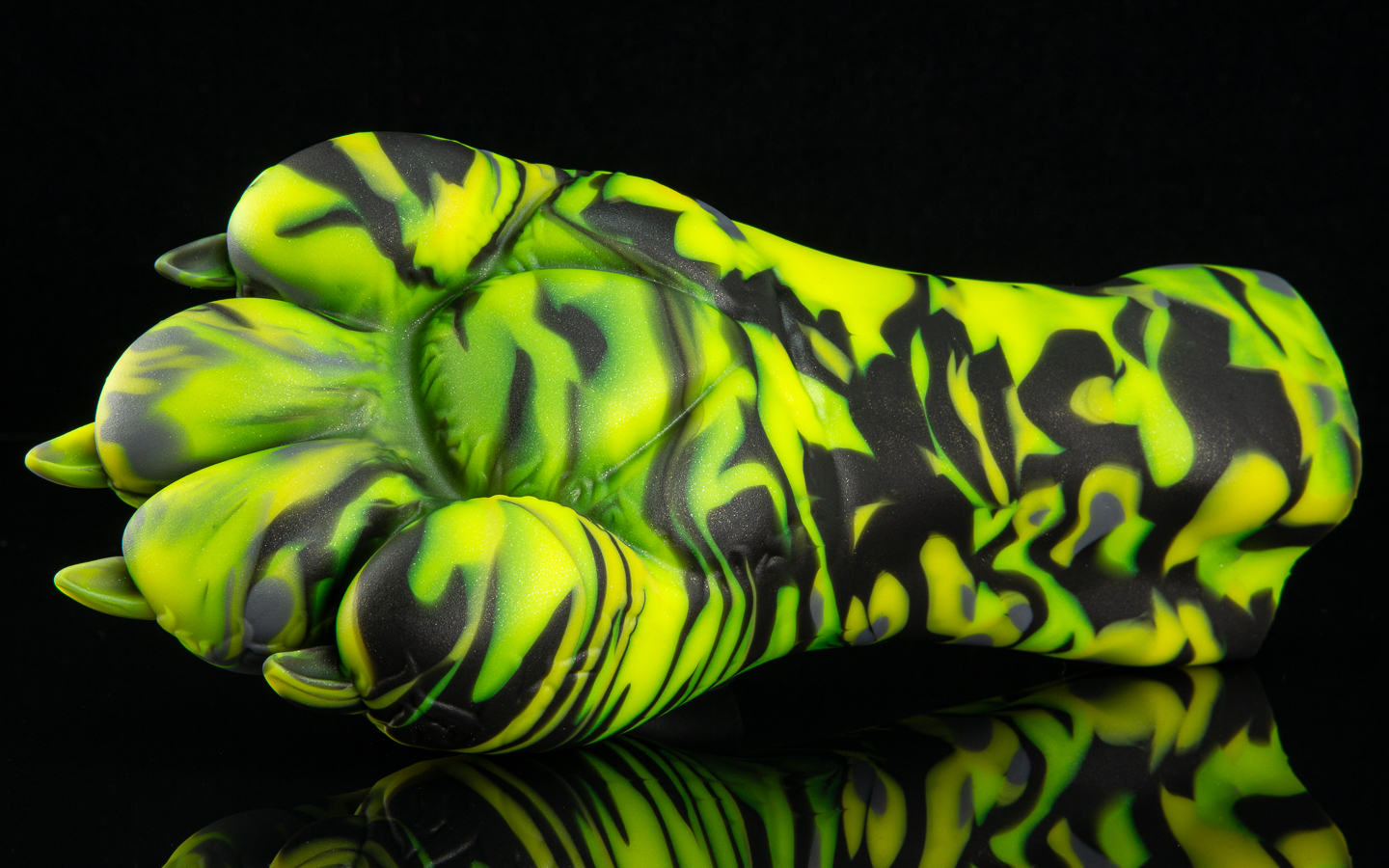 Gideon's signature comes in a coffee and chocolate swirl, with separately-cast pawpads made from an even softer silicone than the main paw - giving them a lovely 'squish'. The Silverfox style is produced in the same way but in different colours. Give those toebeans a pinch, they're super cushiony!