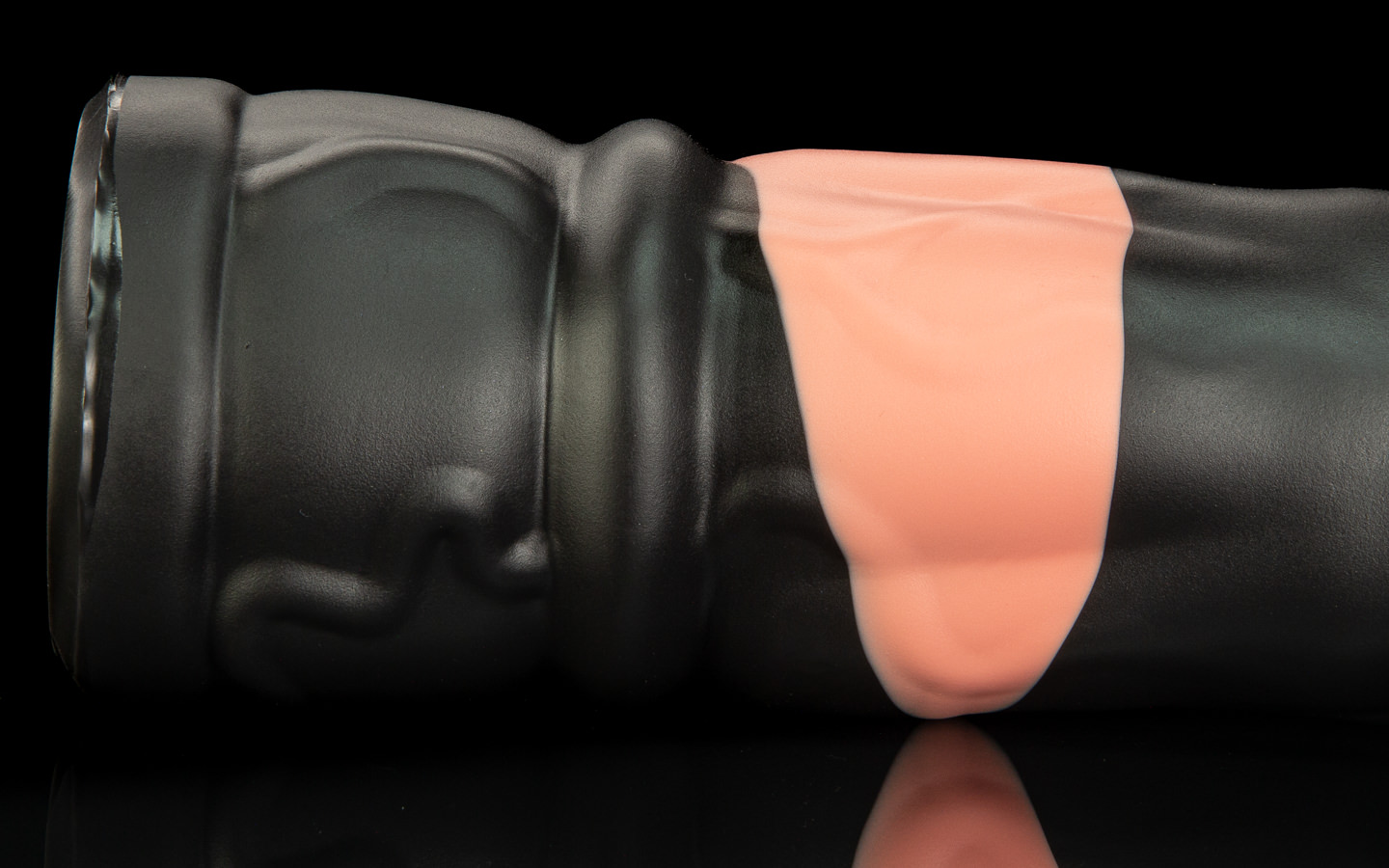 The entrance in his flare quickly opens up into a broader urethral tunnel, which is smooth, but lightly rippled with a delicate skin texture. If you slip past his medial ring, you’ll feel it squeeze over you before opening up further into his depths. By the time you hilt, his broad, flat flare presses squarely to your crotch.