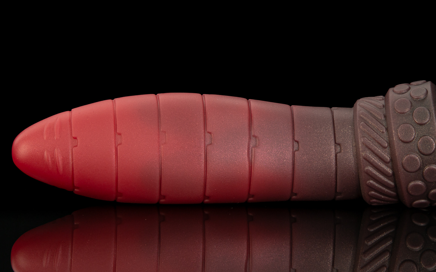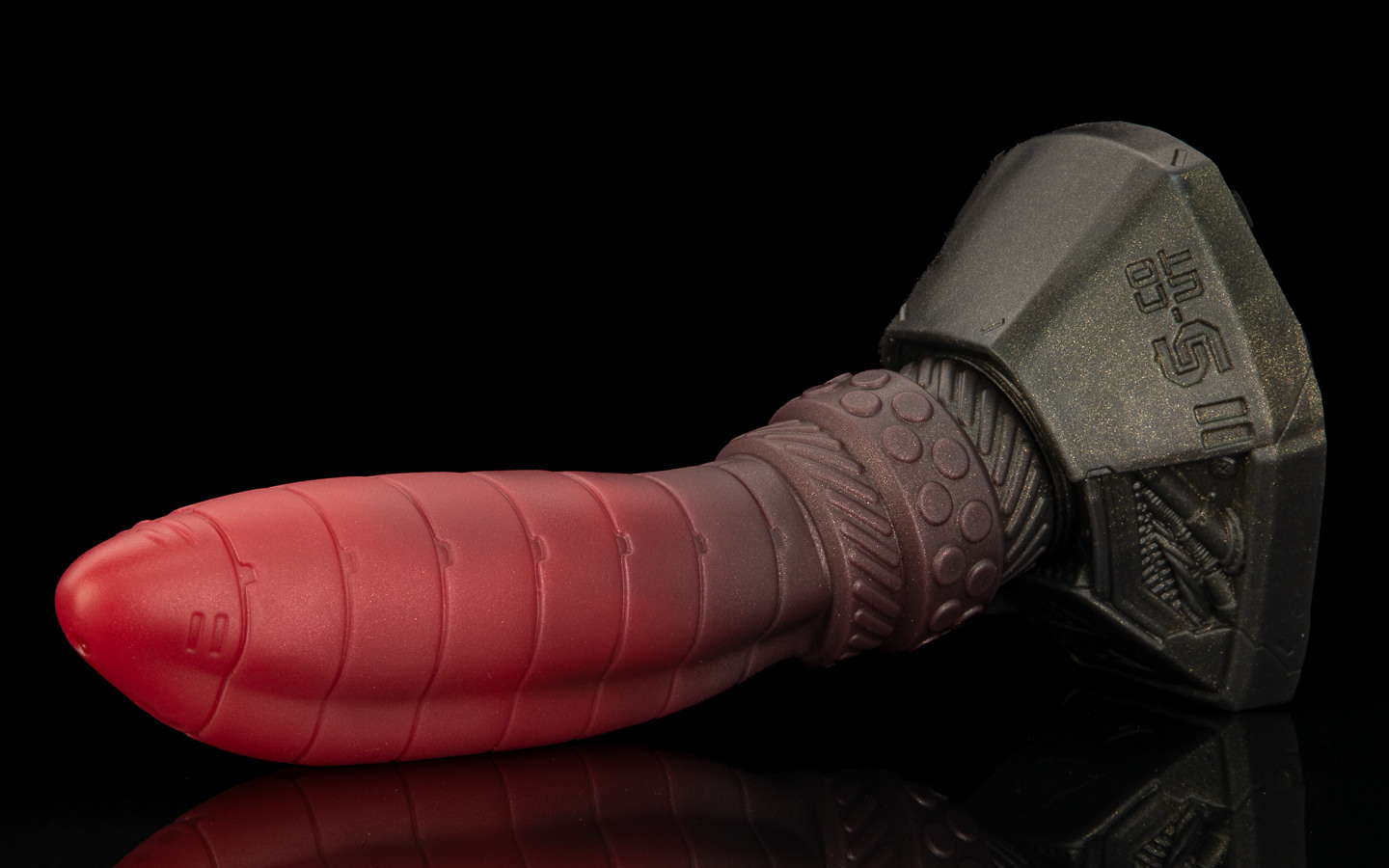 The base is a dark steel and red swirl.